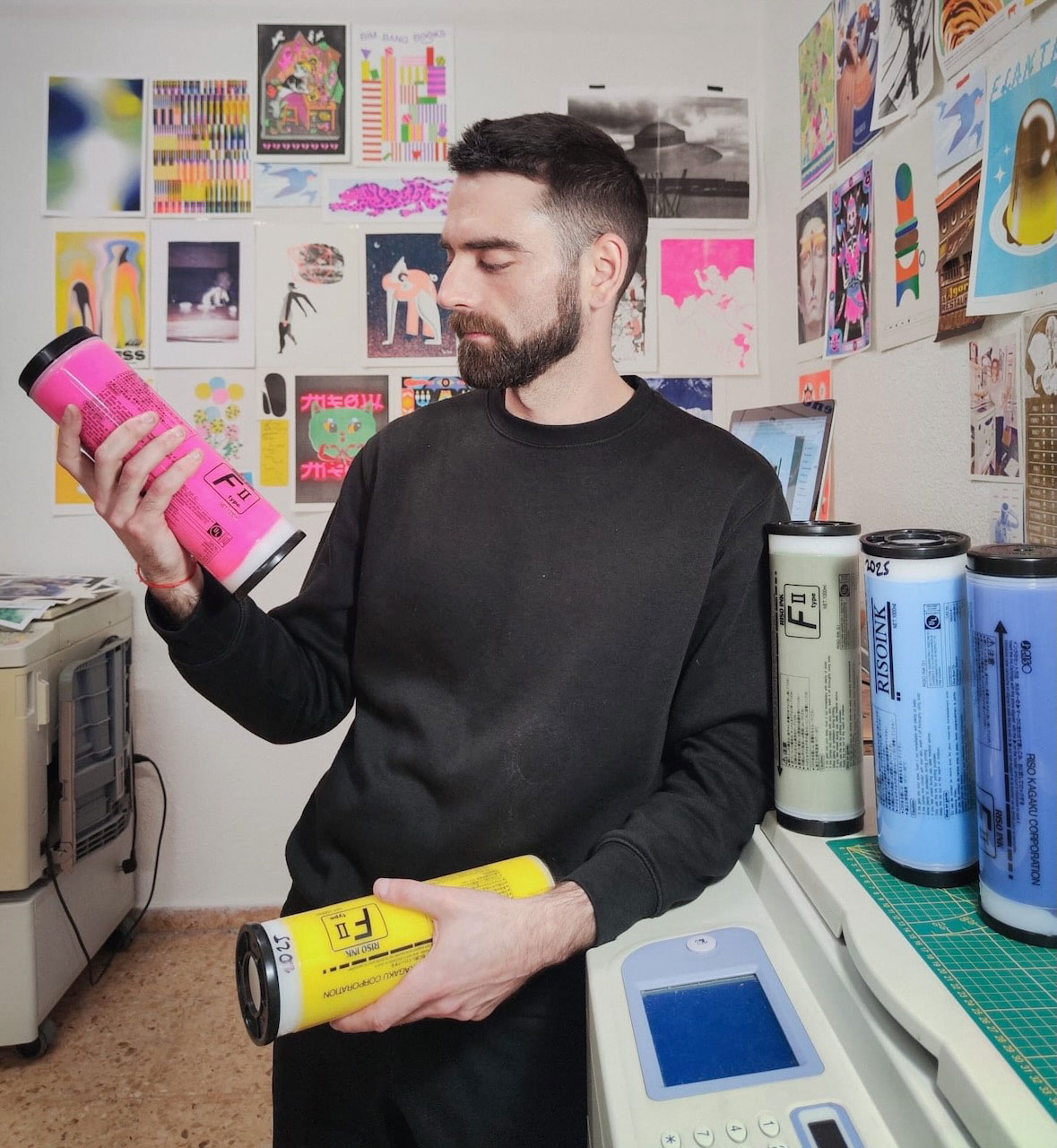 Por otra parte, la edad del taller equivaldría a la edad de un ser humano, o eso pienso yo, con esta técnica más. Hasta el momento hemos impreso el trabajo de ilustradores y otros editores independientes. Impartimos talleres, y creo que es lo más gratificante, enseñar a gente curiosa, qué es esta técnica, que incluso finalizado el taller, siguen sin entender. Simplemente ven que han sacado unas láminas increíbles. Me ha ayudado muchísimo a conectar y conocer a otros artistas y diseñadores, y con gente alejada totalmente del oficio creativo y de la creatividad en si, gente buscando un impresor y que de repente sólo quieren imprimir con esto, por los resultados conseguidos, y sobretodo imprimir el trabajo y conectarme con la gente que admiraba cuando estaba estudiando, así que aunque la Riso haya arruinado mi vida, esto es lo mejor que me da mes a mes. Además una cosa increíble es que somos relativamente pocos estudios los que nos especializamos en esta técnica y mi cosa favorita es la conexión y la comunidad que genera esto, las fotocopiadoras que unen a la gente.