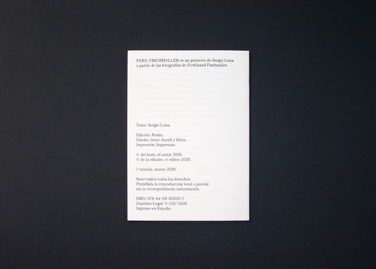 Ferd. Fischmaller es un proyecto editorial ideado por Sergio Luna a partir del hallazgo de un archivo fotográfico atribuido a un enigmático autor alemán. El libro, editado por Festiu y con diseño de Estiu e Irene Aurell, se mueve en un terreno ambiguo donde el documento histórico y la ficción conviven sin necesidad de resolverse.
