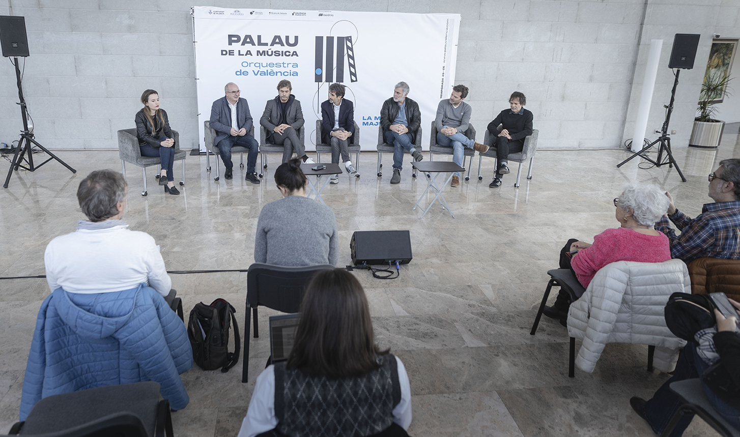 El presidente del Palau de la Música, José Luis Moreno; el director del Palau, Vicente Llimerá; la subdirectora de Música, Nieves Pascual; el director Daniel Abad y los integrantes del grupo La Habitación Roja han presentado el concierto “La Habitación Roja con la Orquesta de València”. La cita será el próximo 22 de mayo de 2026 en la Sala Iturbi del auditorio municipal en un formato de fusión sinfónica e indie-rock, que será dirigido por Daniel Abad. El concierto coincide, además, con el 30 aniversario del grupo valenciano, y por ello hará una selección especial de canciones de toda la trayectoria del grupo. Las entradas ya están a la venta en las taquillas del Palau y a través de www.palauvalencia.com.
